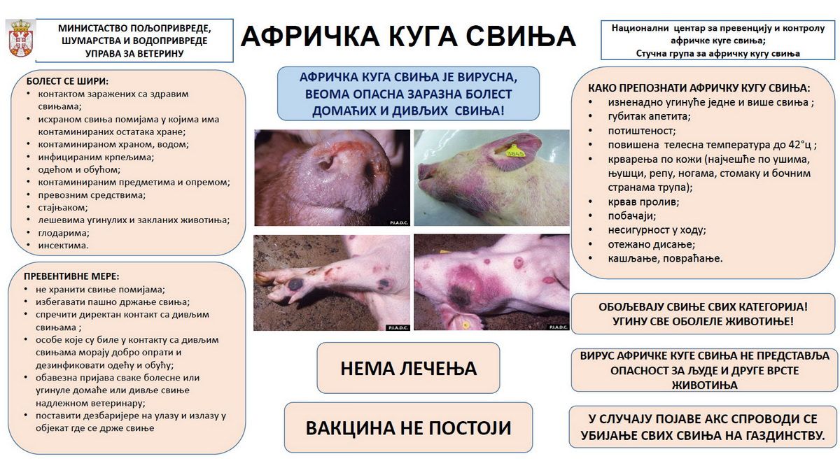 1. jun 2023.17. oktobar 2025.0 0 Zbog nepovoljne epizotiološke situacije u okruženju vezane za pojavu zarazne bolesti životinja AFRIČKA KUGA SVINJA a u cilju prevencije, postavljamo AKS uputstvo za vlasnike. afrička kuga svinja