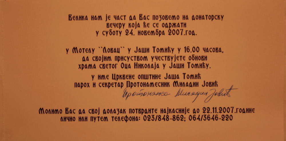 Protonamesnik Miladin Jović je u ime svoje Crkvene opštine Jaša Tomić organizovao donatorsku večeru za obnovu hrama svetog Oca Nikolaja.