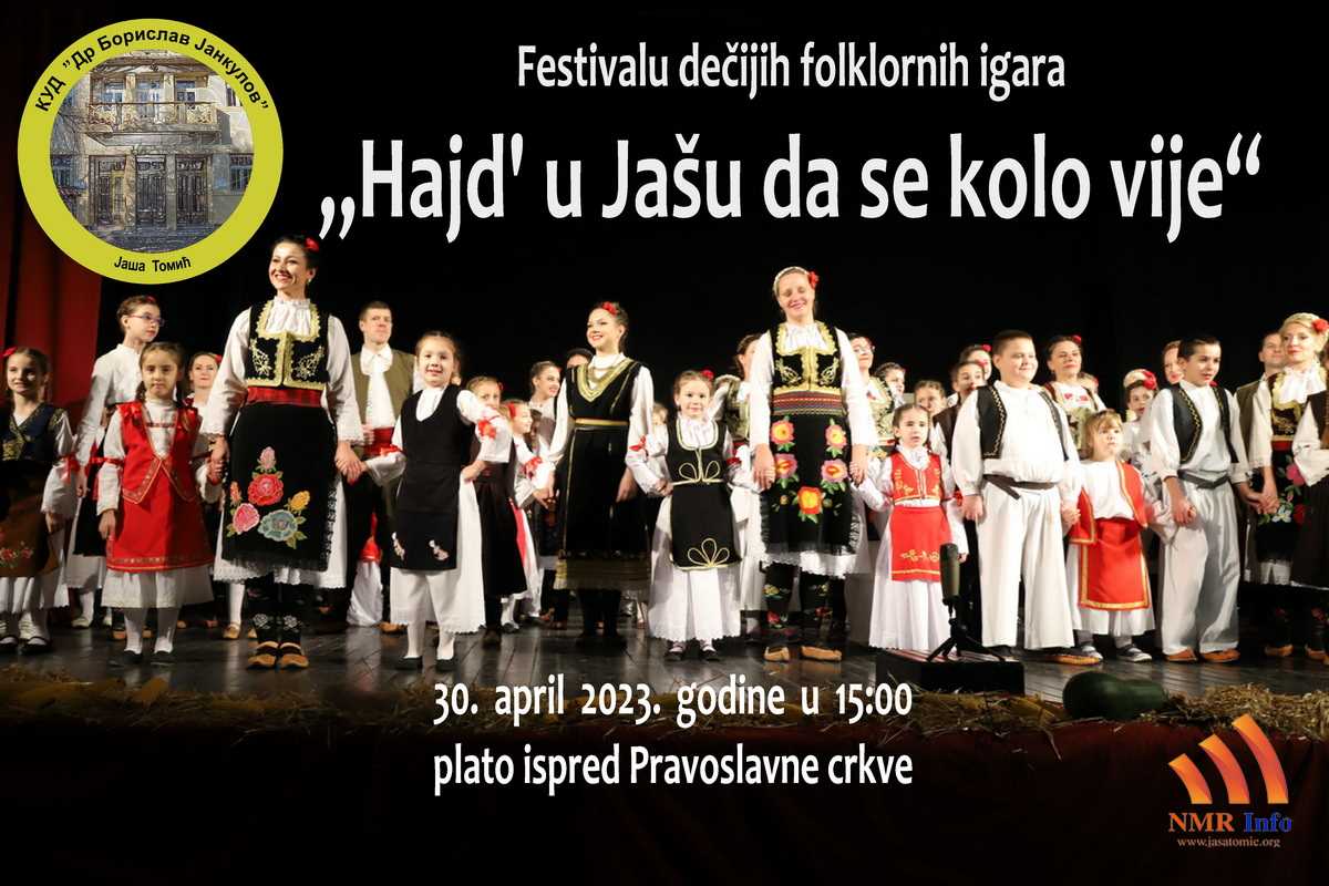 Prvi Festival dečijih folklornih igara “HAJD’ U JAŠU DA SE KOLO VIJE” u organizaciji KUD-a „Dr Borislav Jankulov“ Jaša Tomić održaće se u nedelju, 30. aprila 2023. godine na platou ispred Pravoslavne crkve. Početak od 15.00 časova.