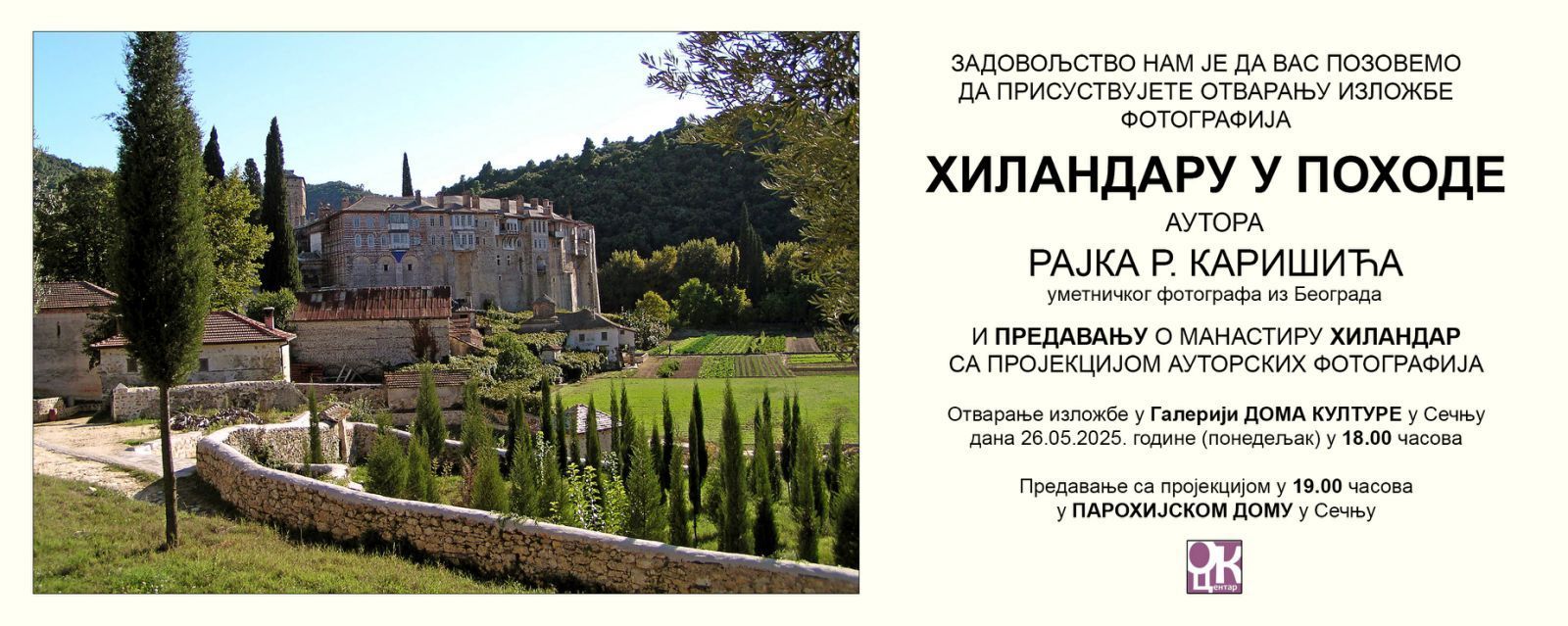 U ponedeljak, 26. maja 2025, godine u Galeriji Doma kulture u Sečnju u 18.00 časova biti održano otvaranje samostalne izložbe fotografija Rajka R. Karišića posvećenih manastiru HILANDAR kao i predavanja sa projekcijom autorskih fotografija našeg manastira u parohijskom domu u 19.00 časova koje je autor bio u prilici da snimi u vremenskom periodu od 2003. do 2024. godine…