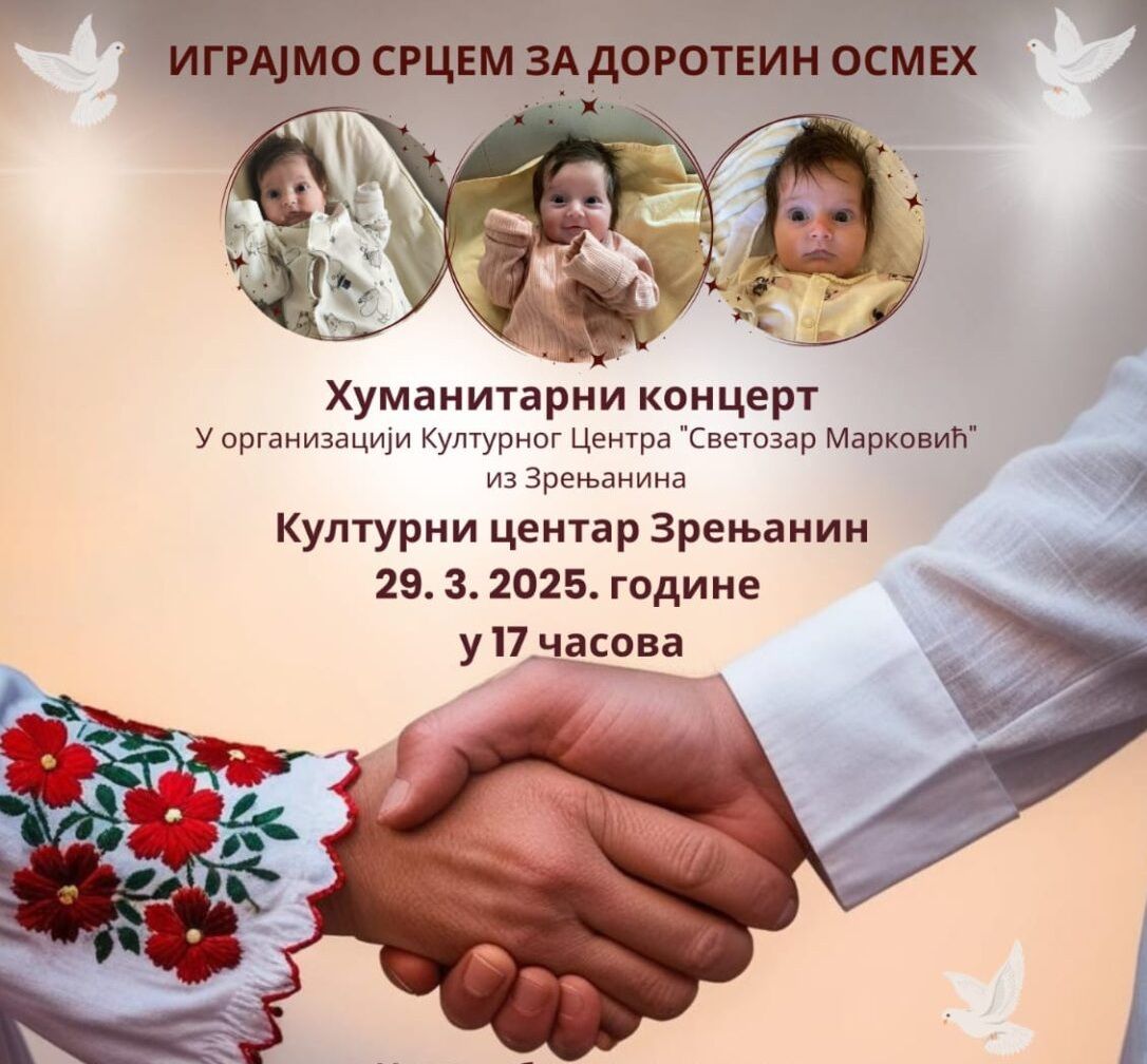 Humanitarni koncert „Igrajmo srcem za Dorotein osmeh“ organizuje Kulturni centar „Svetozar Marković“ iz Zrenjanina u Kulturnom centru Zrenjanina, 29. marta u 17 časova. Na humanitarnom koncertu učestvuju i Kulturno-umetniška društva iz Jarkovca, Jaše Tomić i Sečnja.