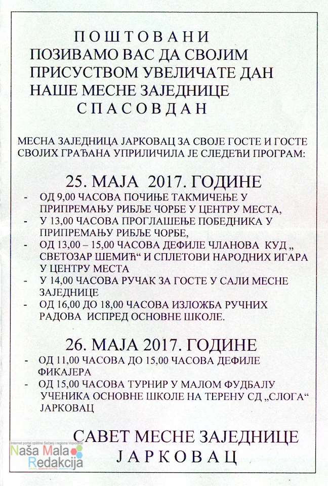 20. maj 2017.15. oktobar 2025.0 0 Jarkovac 25. i 26. maja 2017. godine slavi Spasovdan, dan mesne zajednice. Mesna zajednica Jarkovac je pripremila bogat program i mnoštvo dešavanja od takmičenja u kuvanju riblje čorbe do defilea fijakera. Jarkovac, slava, Spasovdan