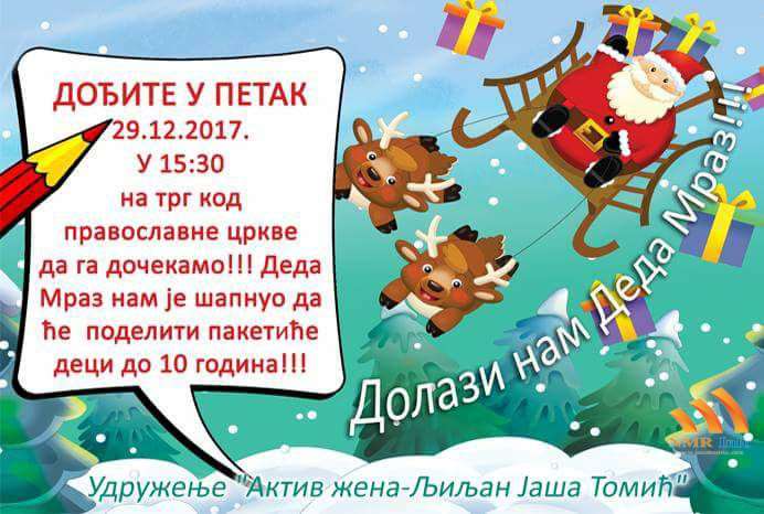 Udruženje „Aktiv žena – Ljiljan Jaša Tomić“ u petak, 29. decembra 2017. godine u 15.30 časova na trgu kod Pravoslavne crkve organizuje doček Deda Mraza i podelu paketića deci. Kako su nam iz udruženja rekli poziv je otvoren za svu decu uzrasta do 10 godina.