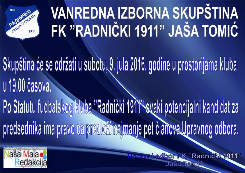 Vanredna izborna skupština kluba se zakazuje za 9. juli 2016. godine u 19.00 časova u prostorijama kluba.