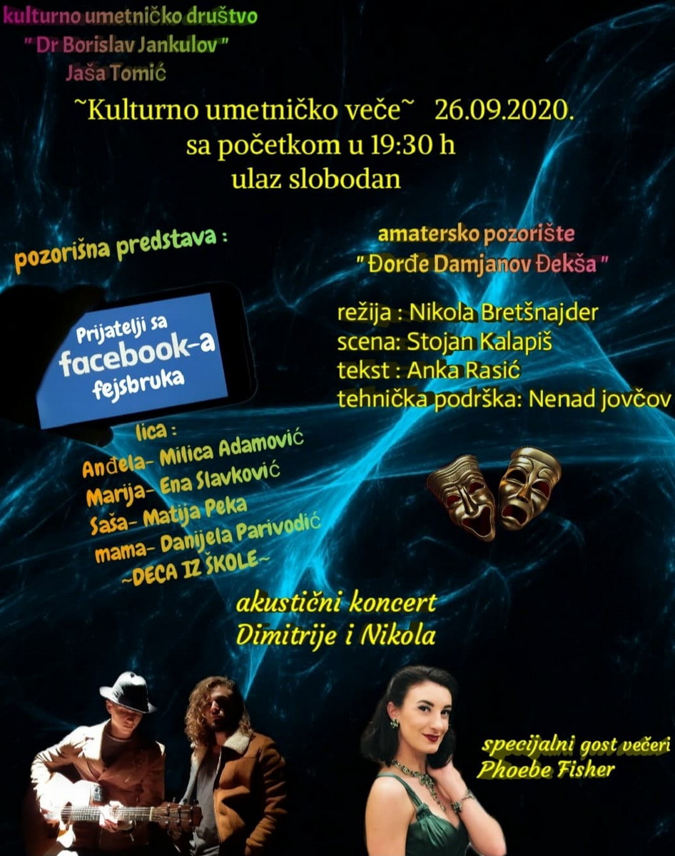 -„Poštovani građani opštine Sečanj, novo rukovodstvo KUD-a će prirediti kulturno-umetničko veče u Domu kulture u Jaša Tomiću. Uživaće te u mini koncertu naših sugrađana Dimitrija i Nikole, a kao specijalni gost večeri nastupiće i Phoebe Fisher iz Engleske poznatija kao „devojka anđeoskog glasa“, zatim možete pogledati pozorišnu predstavu amaterskog pozorišta „Đorđe Damjanov Đekša“ „Prijatelji sa facebook-a“ u režiji Nikole Bretšnajdera.“ izjavio je za NMR Info Nikola Bretšnajder, podpredsednik KUD-a „Dr Borislav Jankulov“.