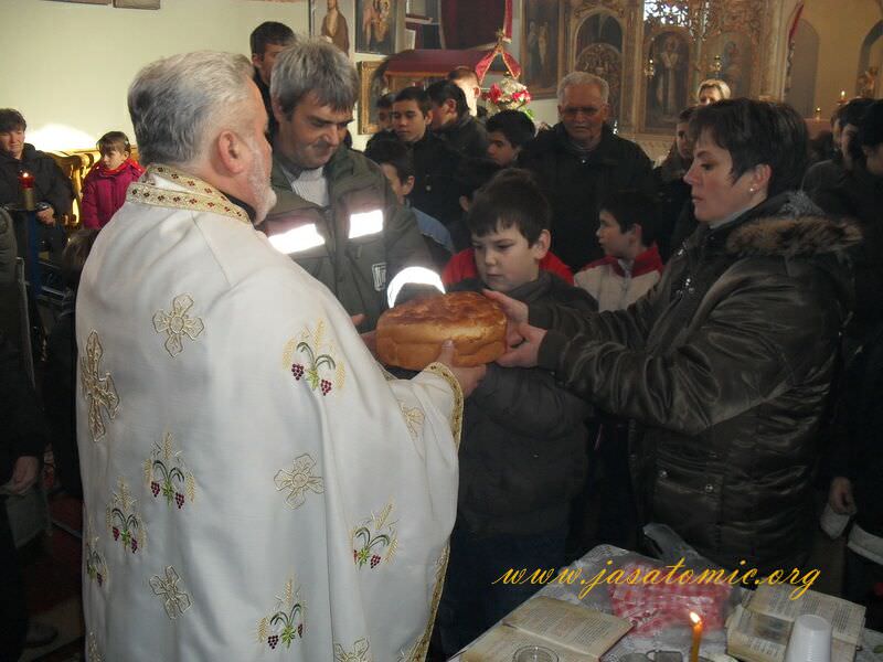 Na Savindan, u petak 27. januara 2012. godine u pravoslavnoj crkvi ”Hram Svetog Nikole” jašatomićki sveštenik, otac Miladin Jović sa porodicom Đakovački, kumovima crkve rezao slavski kolač. Pored malobrojnog broja vernika rezanju slavskog kolača prisutvovali su učenici osnovne škole “Stevan Aleksić”.