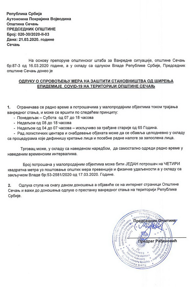 21. mart 2020.15. oktobar 2025.0 0 Na osnovu preporuke Opštinskog štaba za vanredne situcije opštine Sečanj predsednik opštine Sečanj Predrag Rađenović doneo je Odluku o ograničavanju radnog vremena u maloprodajnim objektima na teritoriji opštine Sečanj. covid 19, odluka, opstina, sečanj, štab, virus