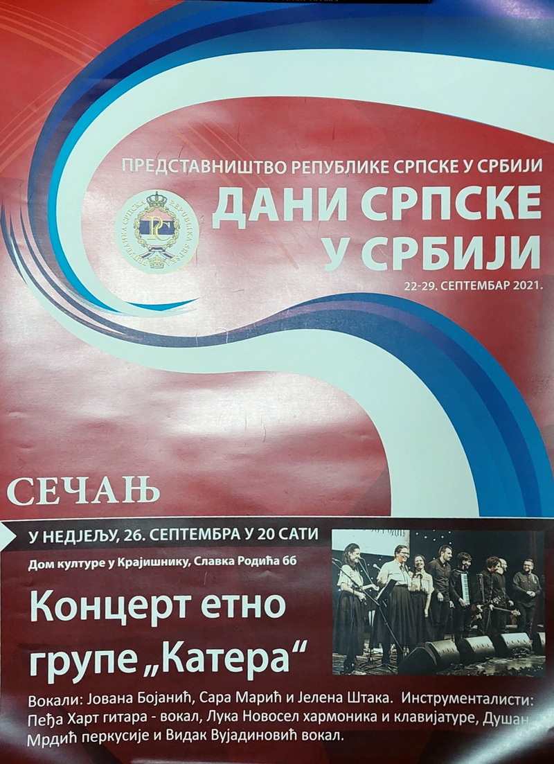 20h Koncert etno grupe „Kantera“ iz Banja Luke, u sklopu manifestacije „Dani Republike Srpske u Srbiji“