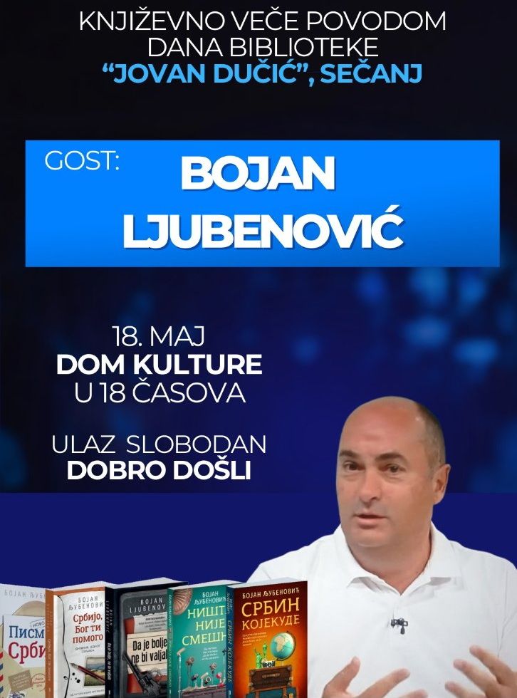 Biblioteka Jovan Dučić povodom obeležavanja Dana Biblioteke poziva Vas na promociju knjiga Bojana Ljubenovića, autora oko 20 knjiga za decu i za odrasle. O veoma aktuelnim Ljubenovićevim knjigama za decu biće reči nadamo se drugom prilikom sa učenicima osnovnoškolskog uzrasta, a ovom prilikom autor će predstaviti knjige za odrasle, romane i zbirke satiričnih priča.