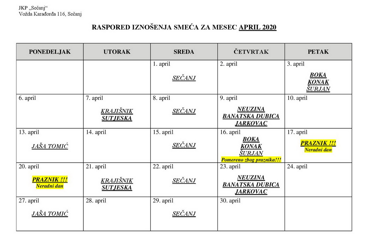 24. mart 2020.15. oktobar 2025.0 0 Zbog vanrednog stanja i epidemije virusa Covid-19, u dogovoru sa kriznim štabom, radi zaštite radnika, iznošenje smeća će se i u aprilu mesecu nastaviti po zimskom rasporedu, odnosno dvaput mesečno. jkp, raspored, sečanj, smece