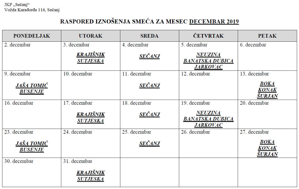 8. decembar 2019.15. oktobar 2025.0 0 Javno komunalno preduzeće „Sečanj“ iz Sečnja je raspored iznošenja smeća po naseljenim mestima za mesec decembar 2019. godine prosledila svim mesnim zajednicama i internet portalu NMR Info. komunalno, raspored, sečanj, smece