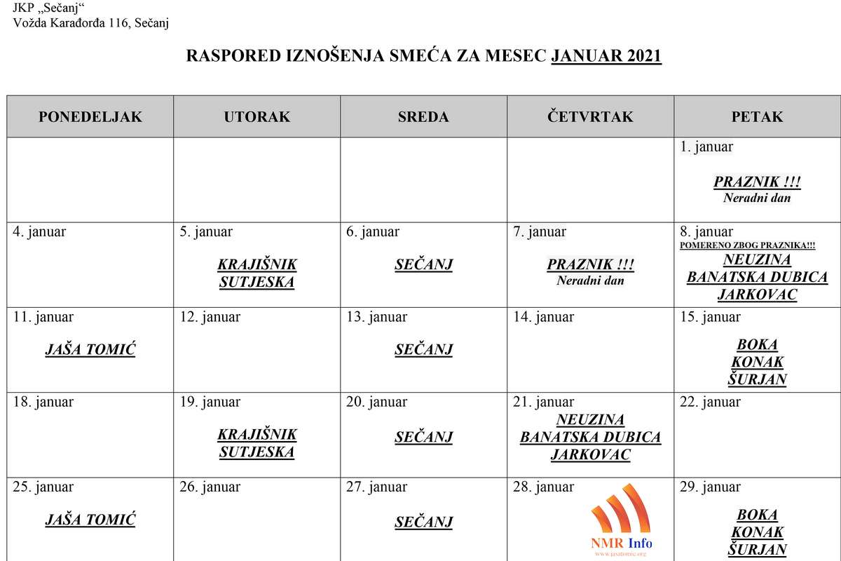 27. decembar 2020.15. oktobar 2025.0 0 Raspored iznošenja smeća za januar 2021. godine Javnog komunalnog preduzeća „Sečanj“ iz Sečnja po svim naseljenim mestima. jkp, raspored, sečanj, smece