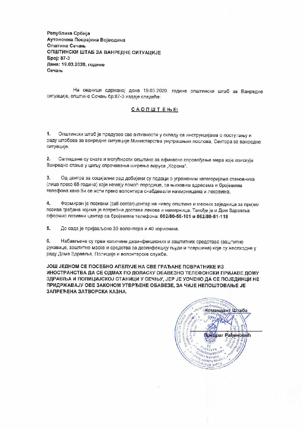 Na sednici održanoj dana 19.03.2020. godine opštinski štab za Vanredne situacije opštine Sečanj izdaje sledeće saopštenje: