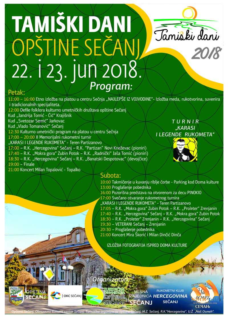 13. jun 2018.15. oktobar 2025.0 0 Opština Sečanj, OKC Sečanj, Turistička organizacija opštine Sečanj, Mesna zajednica Sečanj, rukometni klub „Hercegovina“ i udruženje žena „Naš osmeh“ organizuju manifestaciju „Tamiški dani“ koja će se održati od 22. do 23. juna 2018. godine. Pregledi: 2.046 manifestacija, sečanj, Tamiški dani