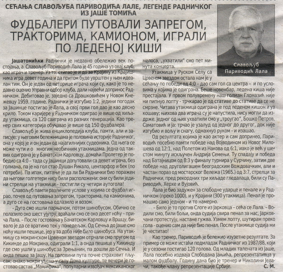Parivodić Slavoljub Lala je višedecenijski igrač i trener fudbalskog kluba Radnički iz Jaša Tomića koji je godinama brižljivo pisao i sakupljao o dešavanjima u klubu. Ovaj Vremeplov, kako ga je nazvao Lala u celosti objavljujemo smatrajući da će naići na veliko vaše interesovanje.